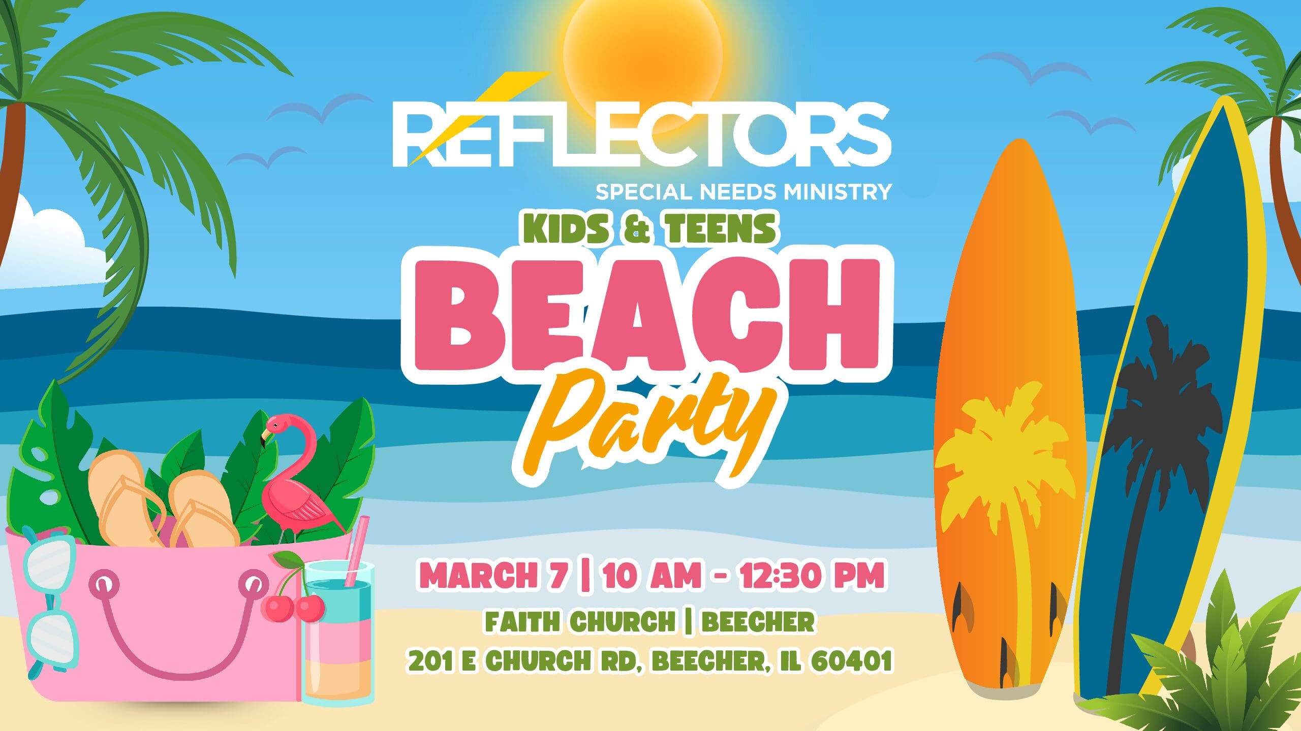 Join us for a Reflectors-sponsored Beach Party at Faith Beecher on Saturday, March 7, from 10:00–12:30 PM.